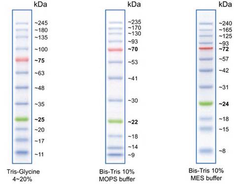 - Easy identification : sharp bands with 25 and 75 kDa reference bands (Green/Red dye)